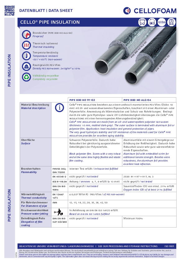 Izolace pro potrubí a roury z polyesterové netkané textilie odpuzující olej a vodu, laminovaná černou polyesterovou fólií. Cello® PIPE 800 HO 91-02 je velmi silná izolace s vynikající pružnou povrchovou vrstvou.