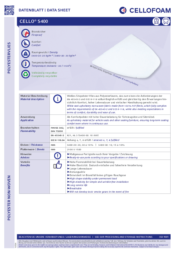 Cello® S400 je bílá výplň sedáku ze 100% PET vláken, která plně splňuje požadavky norem EN 45545-2 a ECE R-118 a zároveň splňuje očekávání ohledně pohodlí, dlouhé životnosti a snadné manipulace.