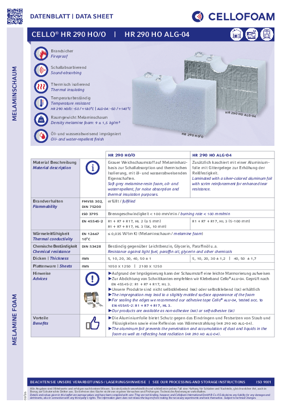 Impregnovaná měkká pěnová hmota na melaminové bázi (vyrobeno z Basotect®) odpuzující olej a vodu. Cello® HR 290 HO ALG-04 je dodatečně laminovaná hliníkovou fólií vyztuženou mřížkou ze skelných vláken pro zvýšení odolnosti proti roztržení.