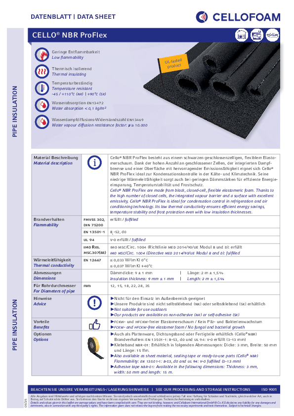 Cello® NBR ProFlex se skládá z černé, pružné elastomerové pěny s uzavřenými buňkami. Díky vysokému počtu uzavřených buněk, integrované parozábraně a povrchu s vynikající emisivitou je Cello® NBR ProFlex ideální pro regulaci kondenzace v chladicí a klimatizační technice. Nízká tepelná vodivost zajišťuje efektivní úspory energie, teplotní stabilitu a ochranu proti mrazu i při nízkých tloušťkách izolace.