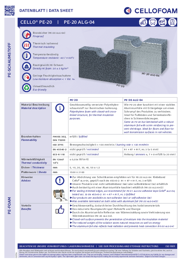 Zesíťovaná PE pěna s uzavřenými póry. Výhody Cello® PE-20: nízká hmotnost, minimální absorpce vody.