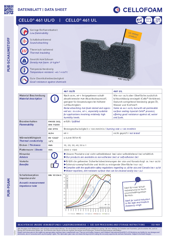 PUR pěna bez zataveného povrchu. Výhody Cello 461 UL/O: vynikající absorpční hodnoty, použití v horkém a vlhkém prostředí, speciální výhoda: UL certifikace.