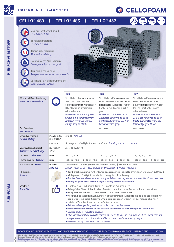 PUR pěna s perforovaným koženkovým povrchem. Výhody Cello® 485: velmi odolný a snadno čistitelný povrch, vizuálně atraktivní, vhodný pro použití na viditelných plochách.